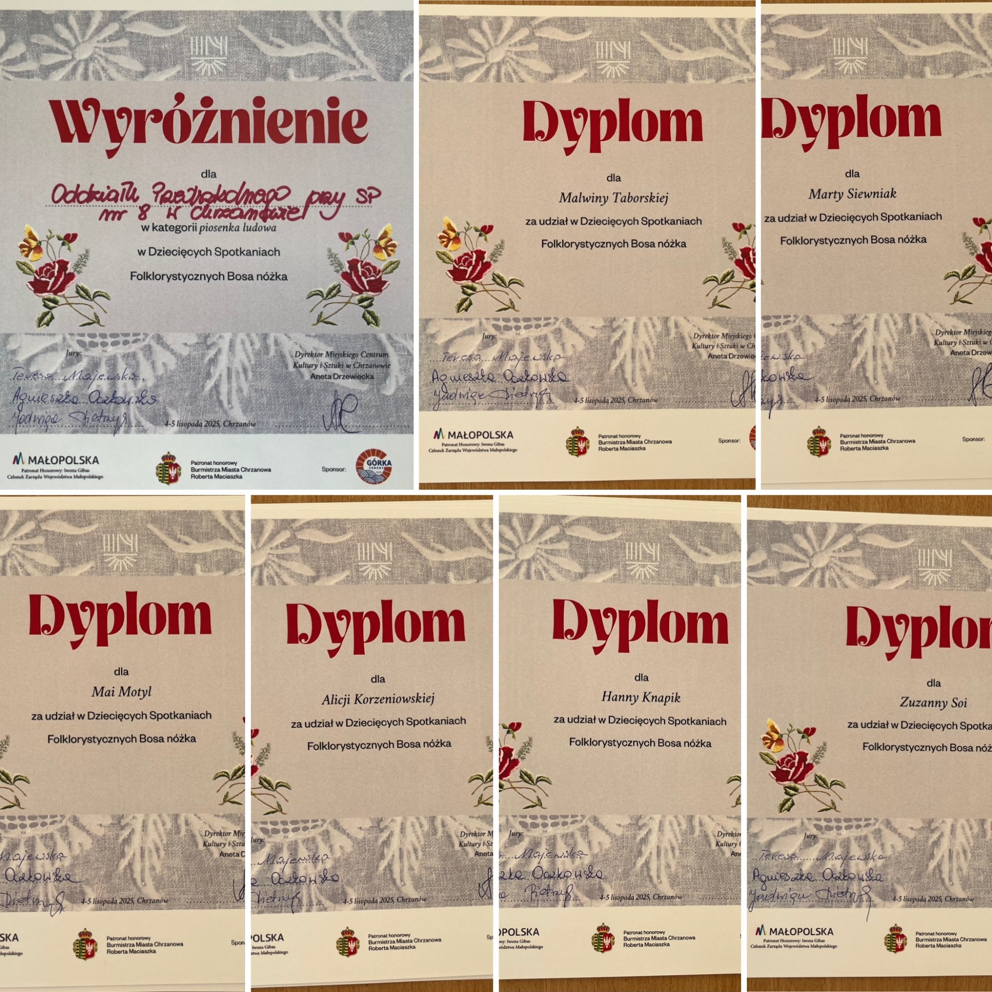 W dniu dzisiejszym dziewczynki: Hania, Malwina, Alicja, Maja, Zuzia i Martusia reprezentowały nasze oddziały przedszkolne na konkursie folklorystycznym „ Bosa Nóżka" za które otrzymały WYRÓŻNIENIE .